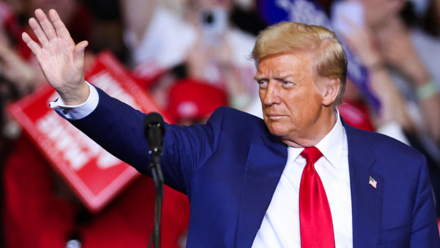 O ex-presidente dos EUA e candidato presidencial republicano Donald Trump deixa o palco após um comício de campanha no Bryce Jordan Center em State College, Pensilvânia, em 26 de outubro de 2024. Foto: AFP