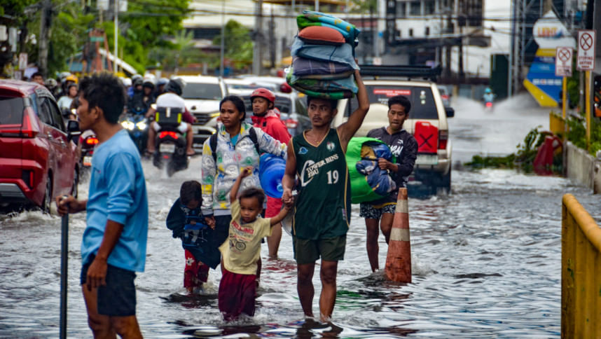 Moradores carregando seus pertences atravessam uma rua inundada na cidade de Mandaue, província de Cebu, em 4 de novembro de 2025, após a passagem do tufão Kalmaegi durante a noite. Foto: AFP