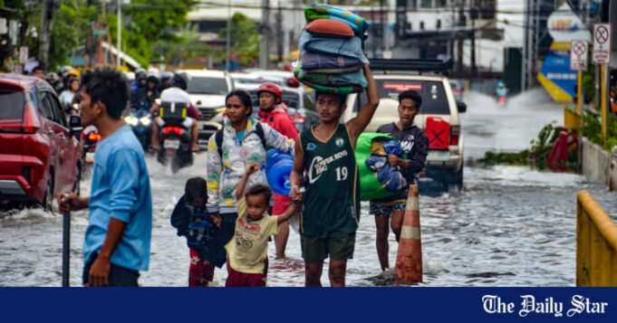 Moradores carregando seus pertences atravessam uma rua inundada na cidade de Mandaue, província de Cebu, em 4 de novembro de 2025, após a passagem do tufão Kalmaegi durante a noite. Foto: AFP