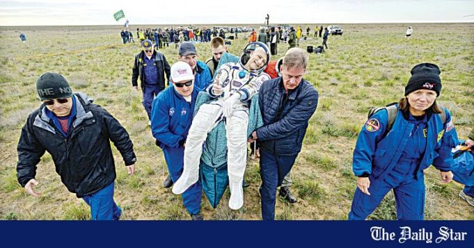 Uma cápsula de Soyuz carregando os americanos e dois cosmonautas russos desembarcou no Cazaquistão ontem, o dia do aniversário de Milestone de Pettit.