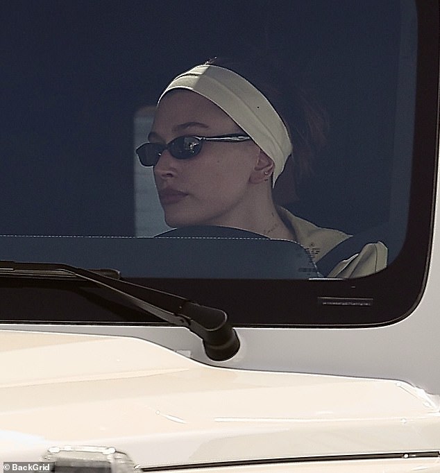 Hailey Bieber foi flagrada de algum tempo para si mesma ao volante de seu novo SUV após o treino matinal no domingo.