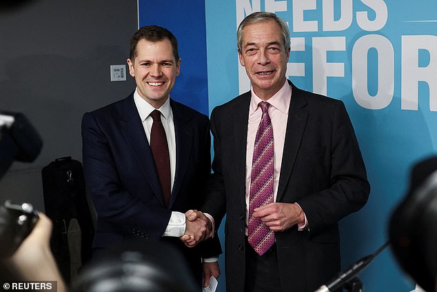O ex-secretário de justiça Tory Shadow, Robert Jenrick, aperta a mão do líder reformista do Reino Unido, Nigel Farage, em uma coletiva de imprensa, esta tarde, após desertar