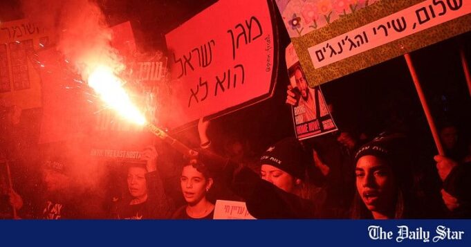 Um demonstrador acende um brilho à medida que outros se reúnem para cantar slogans durante um protesto pedindo a liberação de reféns mantidos em cativeiro em Gaza desde o ataque de 7 de outubro de 2024 por militantes palestinos fora da sede do Ministério da Defesa de Israel em Tel Aviv em 22 de fevereiro de 2025. Foto : AFP