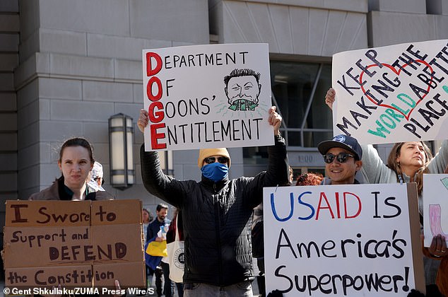 Manifestantes segurando placas fora da sede da USAID em Washington, DC, em 28 de fevereiro, para apoiar os funcionários depois que Elon Musk e Doge fecharam a agência e demitiram a maior parte de seus funcionários