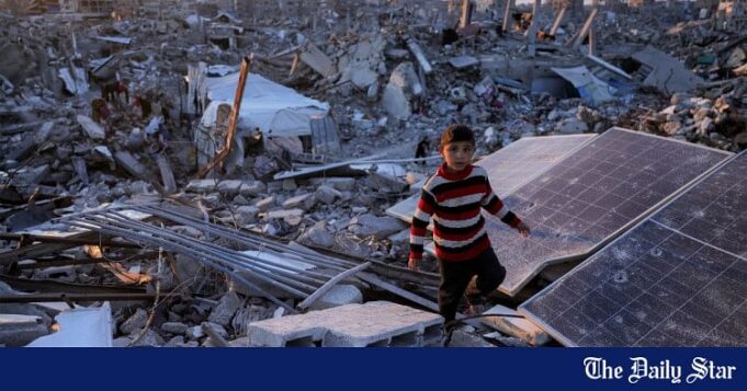Um garoto passa por painéis solares quebrados em meio a escombros em Jabalia na faixa do norte de Gaza em 14 de abril de 2025. Foto: AFP