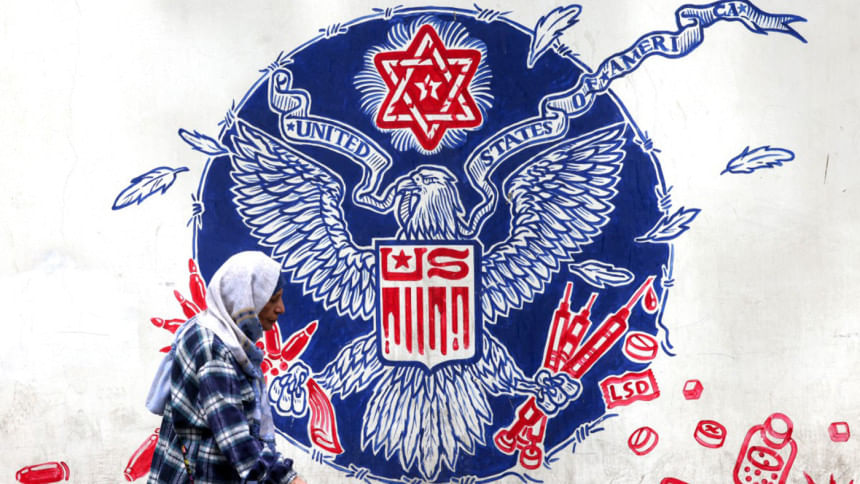 A woman walks past a mural depicting a mock version of the Great Seal of the United States, with the eagle holding syringes and ammunition cartridges in its talons and a Star of David painted above with other drugs and firearms nearby, painted on the outer walls of the former US embassy in Tehran, colloquially-referred to as the “Spy Den,” on April 8, 2025. Photo: AFP