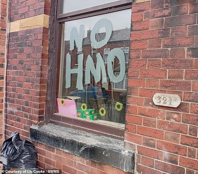 Liv Cooke, um magnata milionário do setor imobiliário que possui HMOs em toda a Grã-Bretanha, foi alvo de vândalos que escreveram as palavras ‘No HMO’ em grandes letras cinza na porta e na janela da frente.