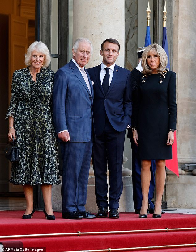 O rei Carlos III do Reino Unido e a rainha consorte Camilla chegam ao Palácio do Eliseu para uma reunião informal com o presidente francês Emmanuel Macron em 2023