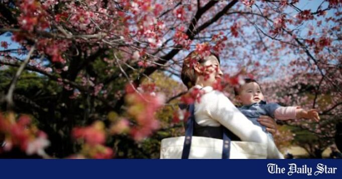 Um bebê de sete meses de idade e sua mãe olham para as flores de cerejeira de Kanzakura, em flor. Foto do arquivo da Reuters