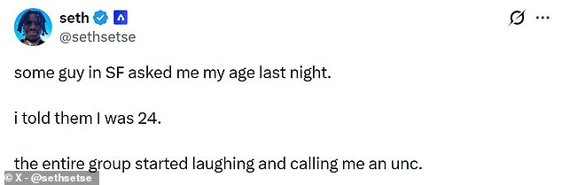 Enquanto isso, um usuário de mídia social postou no Twitter: “Um cara em SF me perguntou minha idade ontem à noite. Eu disse a eles que tinha 24 anos. O grupo inteiro começou a rir e a me chamar de tio.