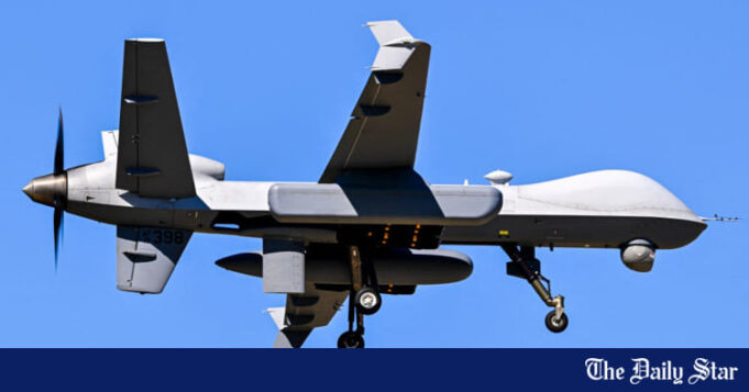 Um drone militar MQ-9 Reaper dos EUA se aproxima para pousar no aeroporto Rafael Hernandez em Aguadilla, Porto Rico, em 29 de dezembro de 2025. Foto: AFP