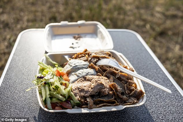 A enfermeira Emily do comitê disse: ‘Se você pensar na quantidade média de carne que uma pessoa come no Reino Unido, se tudo isso foi convertido em kebabs doner – e não estou dizendo que tudo o que alguém come no Reino Unido é kebabs doner, isso é apenas para visualizar – então a quantidade média seria de oito por semana.
