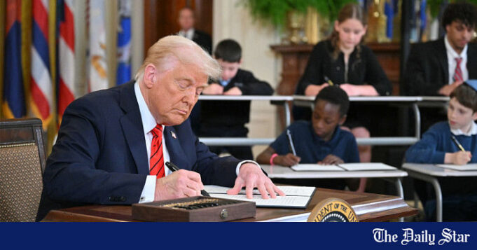 O presidente dos EUA, Donald Trump, assina uma ordem executiva para iniciar o desmantelamento do Departamento de Educação dos EUA, na Sala Leste da Casa Branca em Washington, DC, 20 de março de 2025. Foto: AFP