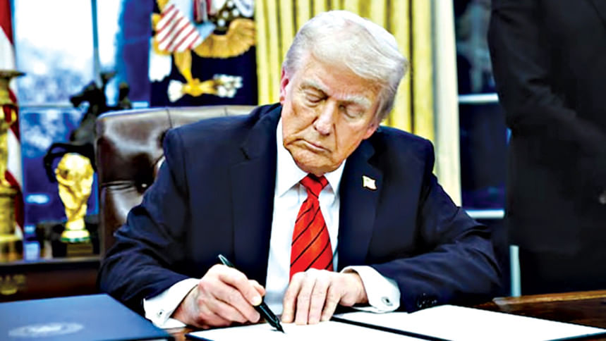 O presidente dos EUA, Donald Trump, assina uma ordem executiva no escritório oval da Casa Branca em Washington, EUA, em 10 de fevereiro.