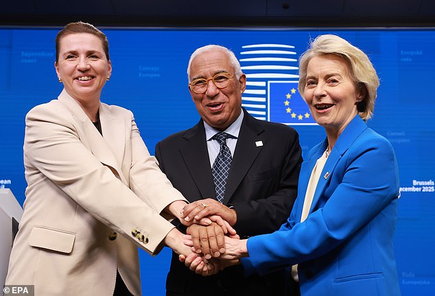 Os líderes da União Europeia concordaram em emprestar à Ucrânia 79 mil milhões de libras para ajudar a Ucrânia a satisfazer as suas necessidades militares e económicas durante os próximos dois anos. Na foto: a primeira-ministra dinamarquesa, Mette Frederiksen (à esquerda), o presidente do Conselho Europeu, Antonio Costa (centro) e a presidente da Comissão Europeia, Ursula von der Leyen (à direita)