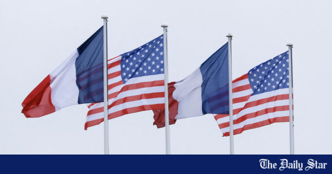 Esta fotografia mostra bandeiras francesas e americanas antes da chegada do vice-presidente dos EUA no aeroporto de Orly, nos arredores de Paris, em 10 de fevereiro de 2025. O vice-presidente dos EUA, JD Vance 10 e 11 de fevereiro de 2025. Foto: AFP
