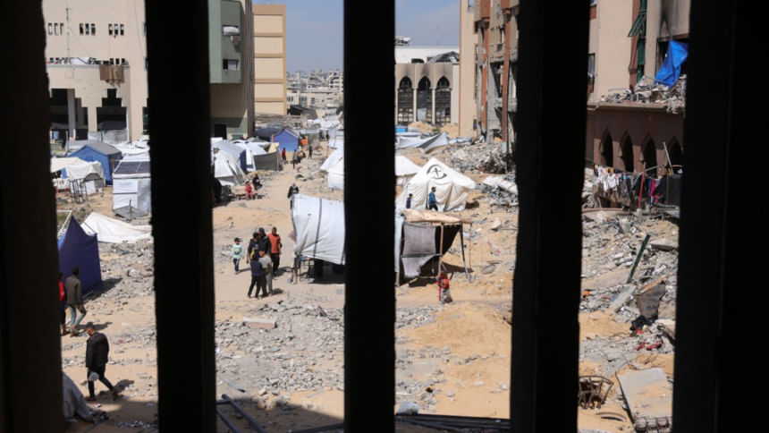 Uma vista parcial mostra as tendas que a habitação deslocou os palestinos no campus da Universidade Islâmica em Gaza City em 16 de abril de 2025. Foto: AFP