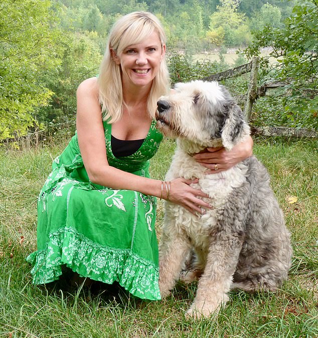 Samantha Brick com seu Old English Sheepdog Indy, o primeiro de seus sete cães a morrer nos últimos três anos
