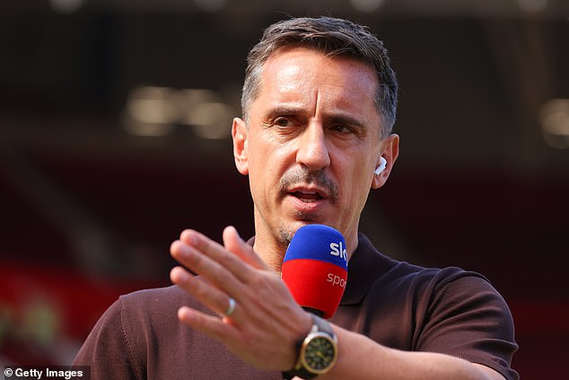 Os apoiadores insultaram Neville com gritos de ‘Gary Neville, que merda, que merda’ – aparentemente em resposta ao seu discurso retórico sobre ‘homens brancos raivosos de meia-idade’ colocando bandeiras da União nas ruas.