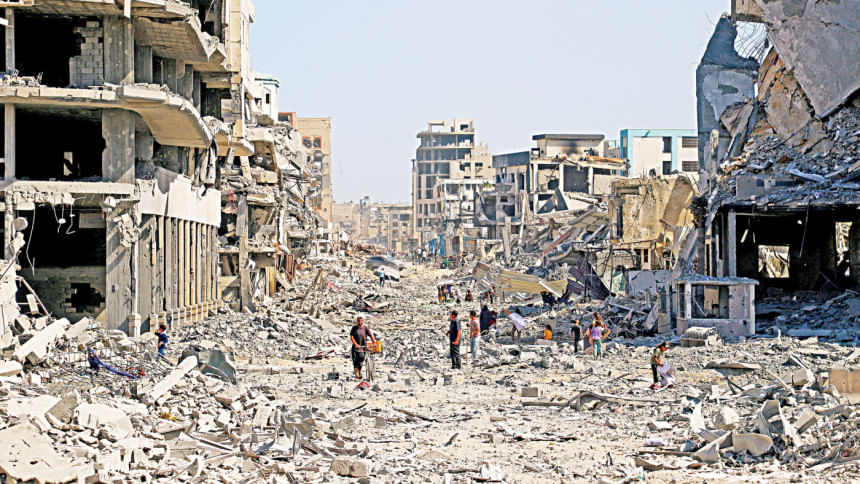 Palestinos caminham entre os escombros após a retirada das forças israelenses da área, em meio a um cessar-fogo entre Israel e o Hamas em Gaza, ontem na Cidade de Gaza. Foto: Reuters