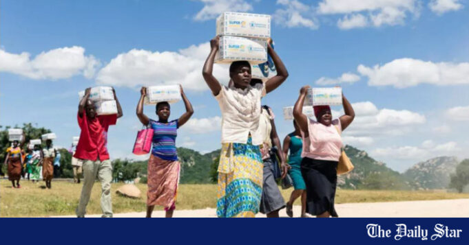 As mães carregam caixas de mingau apoiadas por ajuda dos EUA na Mutokoarea do Zimbábue, pois a seca piorou a fome. Foto do arquivo AFP