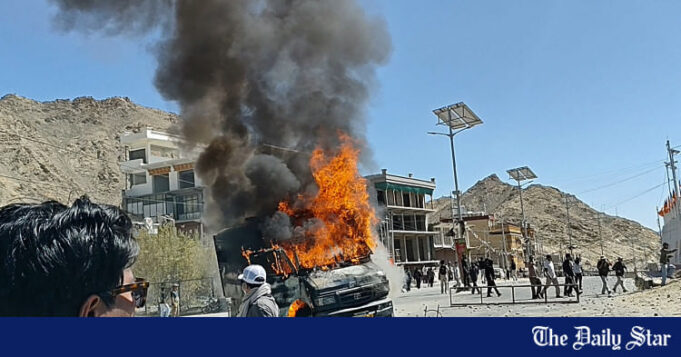 Um veículo policial incendiado pelos manifestantes é retratado ao longo de uma rua perto do escritório do Partido Bharatiya Janata (BJP) em Leh em 24 de setembro de 2025. A polícia indiana em 24 de setembro entrou em conflito com centenas de manifestantes que exigem maior autonomia no território do Himalaia de Ladakh, deixando várias pessoas prejudicadas, disseram autoridades. Foto: AFP/Tsewang Rigzin