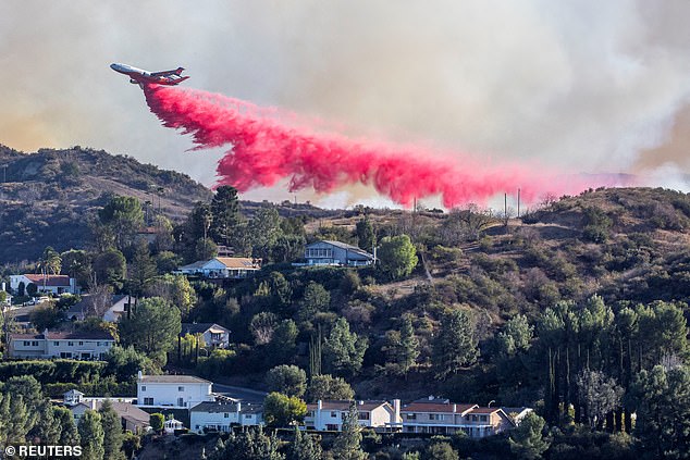 O spray, conhecido como Phos-Chek, foi lançado de nove grandes aviões e 20 helicópteros lançadores de água em Los Angeles para combater os incêndios que vêm queimando desde terça-feira.