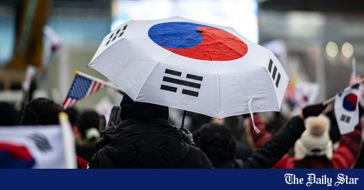 Um defensor do presidente sul-coreano de impeachment, Yoon Suk Yeol, segurando um guarda-chuva com a bandeira sul-coreana, participa de um comício perto de sua residência em Seul, em 6 de janeiro de 2025. Foto: AFP