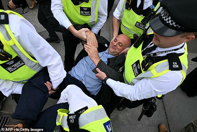 A polícia terá mais poderes para reprimir os repetidos protestos depois que 492 manifestantes pró-palestinos foram presos após o ataque da sinagoga de Manchester (foto: um manifestante é levado pelos policiais depois de ser preso no centro de Londres no sábado)