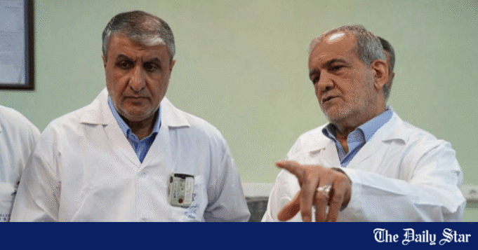 O presidente iraniano, Masoud Pezeshkian, fala com Mohammad Eslami, chefe da Organização Iraniana de Energia Atômica, em Teerã, Irã, em 2 de novembro de 2025. Organização Atômica Iraniana/WANA (Agência de Notícias da Ásia Ocidental)/Divulgação via REUTERS