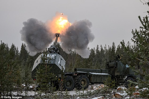 Uma equipe de artilharia sueca dispara um projétil de um obus de arqueiro autopropulsionado durante o ‘Exercício Lightning’ da OTAN em 20 de novembro de 2024