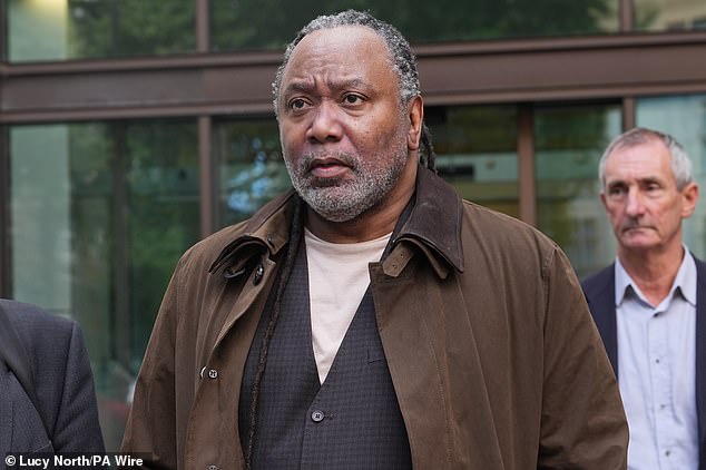 Reginald D Hunter fotografado do lado de fora do Tribunal de Magistrados de Westminster após uma audiência anterior no caso. Ele teve uma intimação contra ele anulada por um juiz