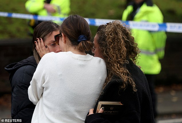 As pessoas foram vistas se confortando perto da sinagoga em Manchester depois que o horror se desenrolou