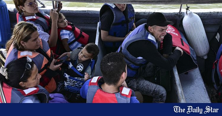Migrantes venezuelanos do Conselho dos EUA Um barco indo para a ilha de Carti, território de Guna Yala no Panamá em 24 de fevereiro de 2025. Centenas de migrantes, muitas delas crianças, barcos de tabuleiro hoje em dia em Cartí, na região indígena de Guna Yala, no Caribe do Panamá. Eles estão a caminho do sul, uma jornada de cerca de 12 horas até o porto de Necoclí, na Colômbia, para continuar por terra, a maioria deles para a Venezuela. Foto: AFP