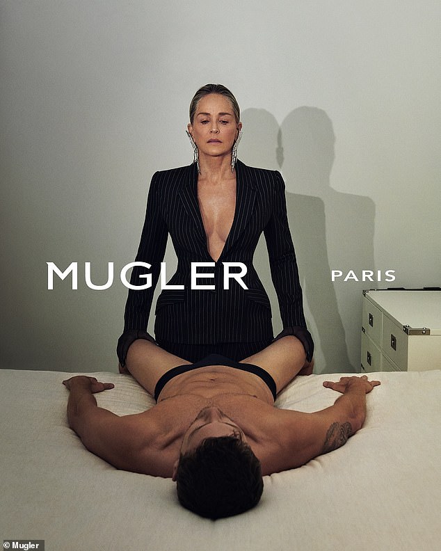 Sharon Stone foi visto fazendo uma pose muito atrevida com um homem para uma nova campanha para Mugler.
