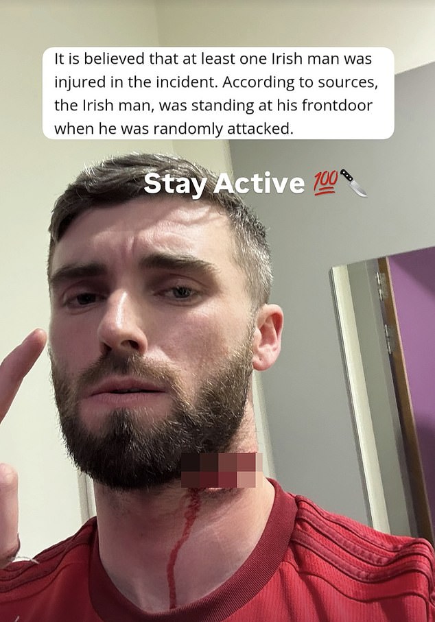 Uma vítima de uma facada em Dublin publicou imagens horríveis de uma fatia no pescoço antes de compartilhar um estalo desafiador com uma cerveja na mão.