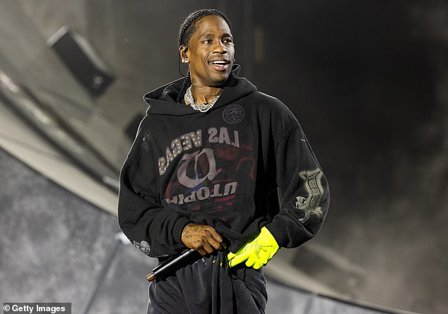 Travis Scott, 35, e sua filha Stormi, sete, roubaram a cena durante sua apresentação em Tóquio no sábado – logo após a chocante aparição de Kanye West; visto em junho em Illinois