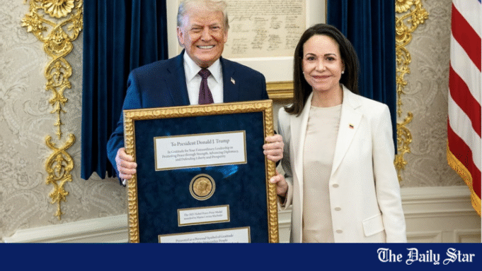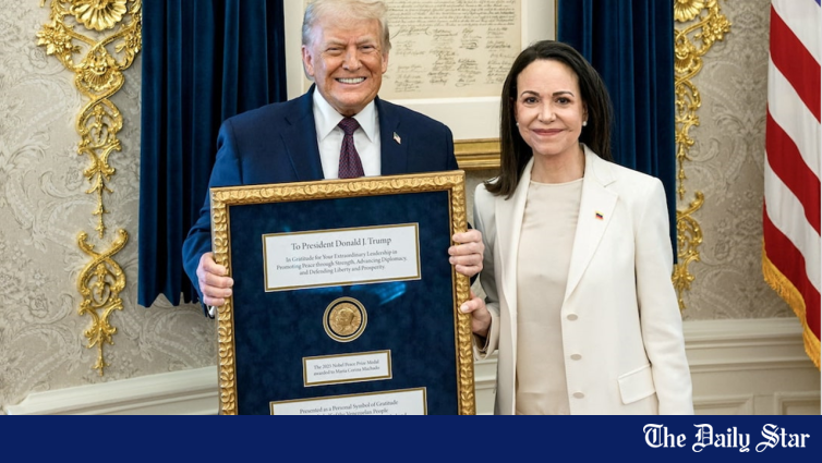 A líder da oposição venezuelana, Maria Corina Machado, entregou a medalha do Prémio Nobel da Paz ao presidente dos EUA, Donald Trump, na quinta-feira, durante uma reunião na Casa Branca, numa tentativa de influenciar os seus esforços para moldar o futuro político do seu país.