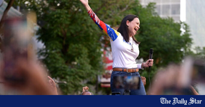 A líder da oposição venezuelana, Maria Corina Machado, gesticula ao se dirigir a apoiadores em um protesto antes da posse do presidente Nicolás Maduro para seu terceiro mandato, na sexta-feira, em Caracas, Venezuela, em 9 de janeiro de 2025. Foto de arquivo:Reuters/Gaby Oraa