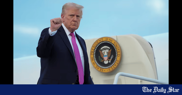 O presidente dos EUA, Donald Trump, gesticula enquanto ele embarca na Força Aérea para partir para Washington, no Aeroporto Municipal de Morristown, em Morristown, Nova Jersey, EUA, 14 de setembro de 2025. Reuters/Ken Cedeno