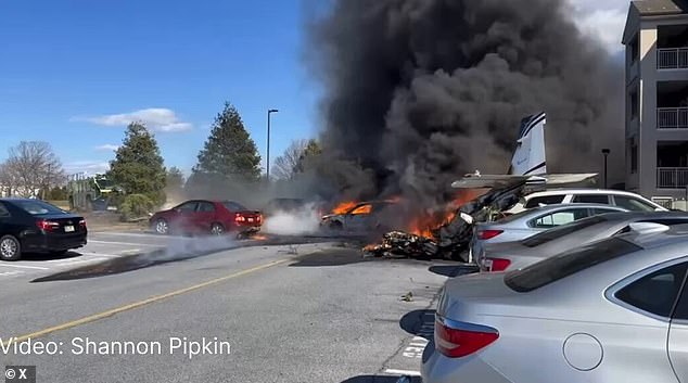 Imagens dramáticas mostraram que a aeronave entrava em chamas em um estacionamento, alinhadas com outros veículos, no município de Manheim