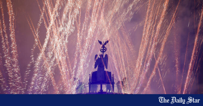 Fogos de artifício explodem sobre o Portão de Brandemburgo durante as celebrações do Ano Novo em Berlim, Alemanha, 1º de janeiro de 2026. REUTERS/Axel Schmidt