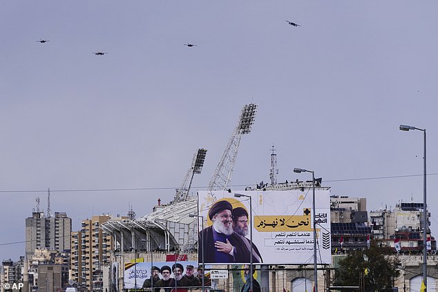 Os caças israelenses voam sobre a cidade durante a procissão fúnebre dos ex -líderes do Hezbollah do Líbano, Hassan Nasrallah e seu primo e sucessor, Hashem Safieddine, em Beirute, Líbano, domingo, 23 de fevereiro de 2025