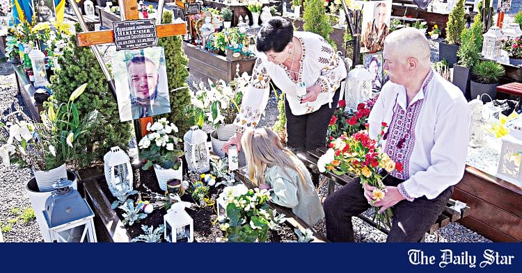Os membros de uma família deitam flores e velas enquanto lamentam o túmulo de um soldado ucraniano caído no cemitério militar de Lychakiv, no domingo de Páscoa em Lviv, Ucrânia, ontem, em meio à invasão russa em andamento. Foto: AFP