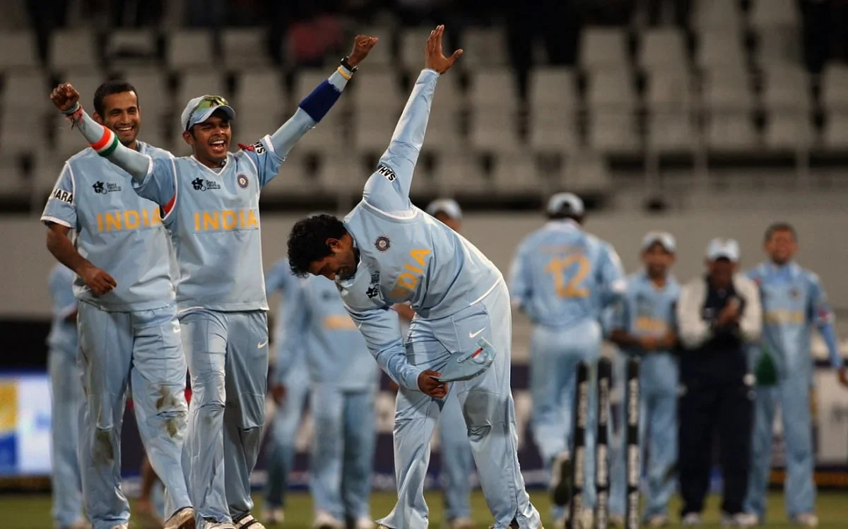 A final da edição de 2007 da Copa do Mundo T20 Masculina da ICC foi disputada entre a Índia e o Paquistão, em Joanesburgo, em 24 de setembro de 2007, e a Índia garantiu uma vitória difícil por 5 corridas naquele jogo para se tornar campeã. (Crédito da imagem: AFP)