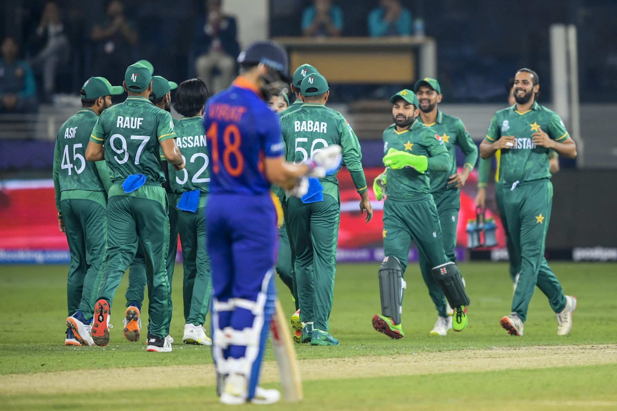 O Paquistão garantiu sua primeira e única vitória na Copa do Mundo T20 sobre a Índia em 24 de outubro de 2021. Aproveitando a invencibilidade de Mohammad Rizwan e Babar Azam na década de 50, o Paquistão perseguiu a meta de 152 corridas em 17,5 saldos sem perder nenhum postigo. (Crédito da imagem: AFP)