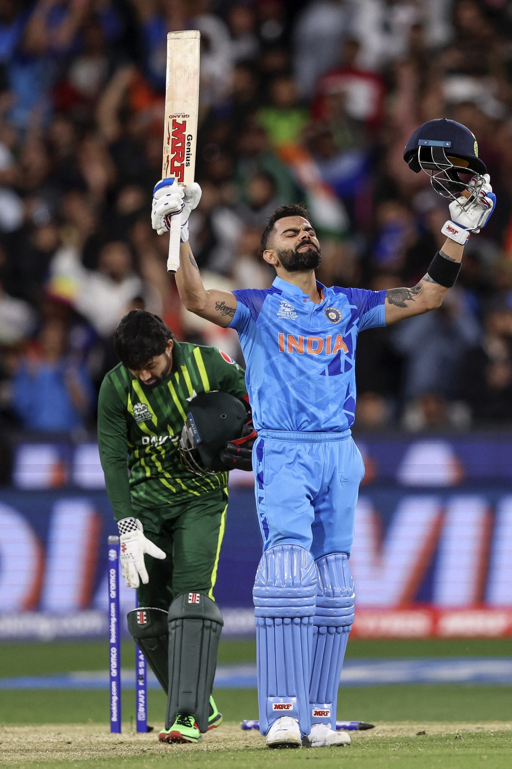 A memorável batida de 82 corridas de Virat Kohli em 23 de outubro de 2022 ajudou a Índia a derrotar o Paquistão por 4 postigos na partida da Copa do Mundo T20 de 2022, disputada no Melbourne Cricket Ground. (Crédito da imagem: AFP)