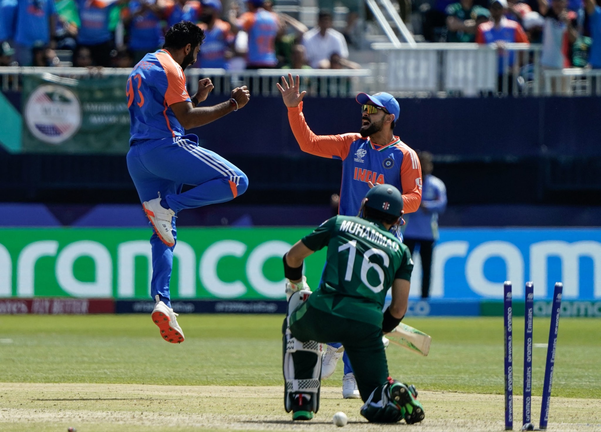 Os 3/7 de Jasprit Bumrah ajudaram a Índia a defender com sucesso o total de 119 corridas e garantir uma vitória de seis corridas sobre o Paquistão na partida da Copa do Mundo T20 de 2024, disputada em Nova York em 9 de junho de 2024. (Crédito da imagem: AFP)