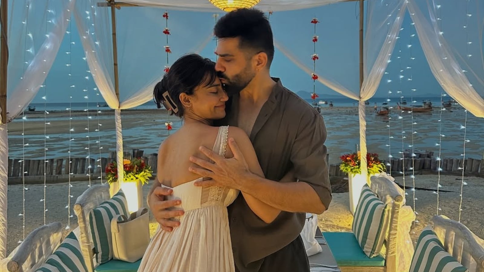 Em outra foto, Surbhi pode ser visto sentado em uma mesa à luz de velas, irradiando alegria com seu sorriso vibrante. A mesa, adornada com bebidas e flores vibrantes, complementa a vibração da praia. Mais uma captura de snap adorável Surbhi Jyoti e seu marido compartilhando um abraço terno sob um dossel iluminado pela fada na praia. A configuração romântica, com uma mesa à luz de velas e o pano de fundo do oceano, cria um momento sonhador e íntimo capturado em Twilight.