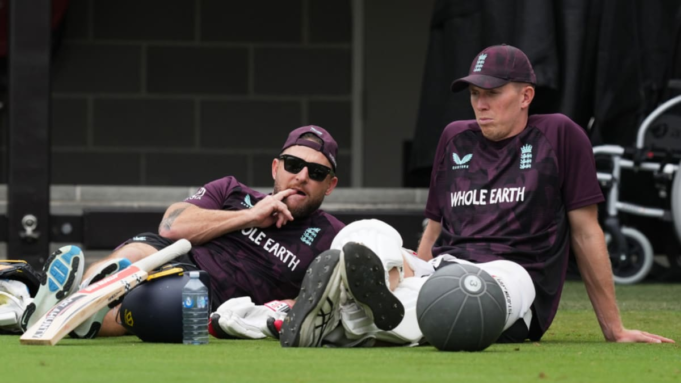 O técnico da Inglaterra, Brendon McCullum, com Zak Crawley (AP)